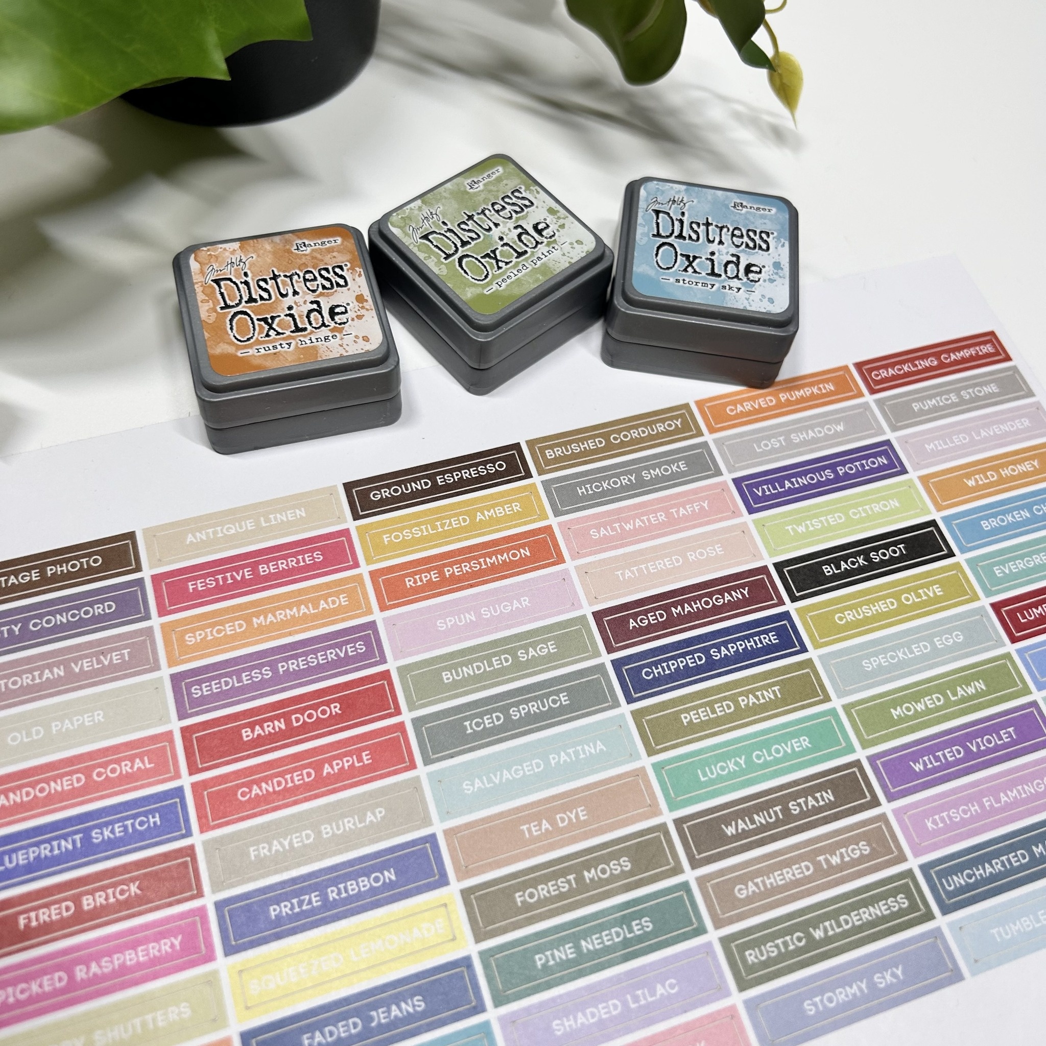 Stickervel met alle namen van de Distress Inkten, om aan de zijkant van de mini inkt pads te plakken en bijbehorende daubers